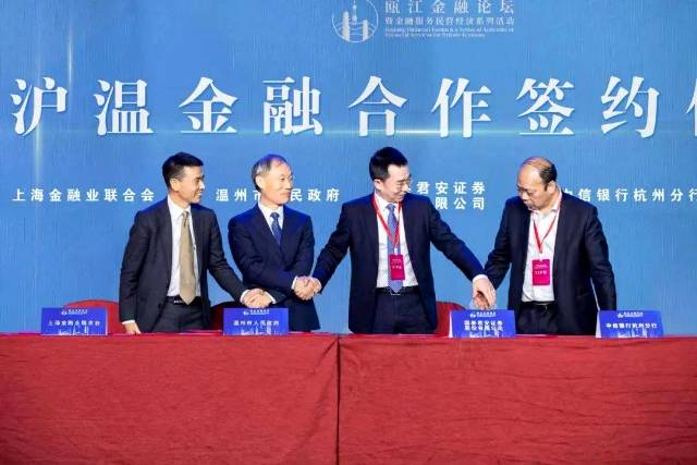 主旨演讲过后,两场圆桌论坛分别以“深化金融改革助推民营企业转型发展”和“金融支持民营经济参与长三角区域一体化发展”为主题。论坛上还进行了一系列沪温金融合作签约。温州市人民政府与上海证券交易所、上海金融业联合会、国泰君安证券股份有限公司、中信银行杭州分行等机构和公司,温州市金融办与上海财经大学商学院、上海交通大学中国金融研究院、中叶资本等单位和企业共同签署了合作协议。最后,与会嘉宾共同见证了温州金融综合服务平台正式启动。